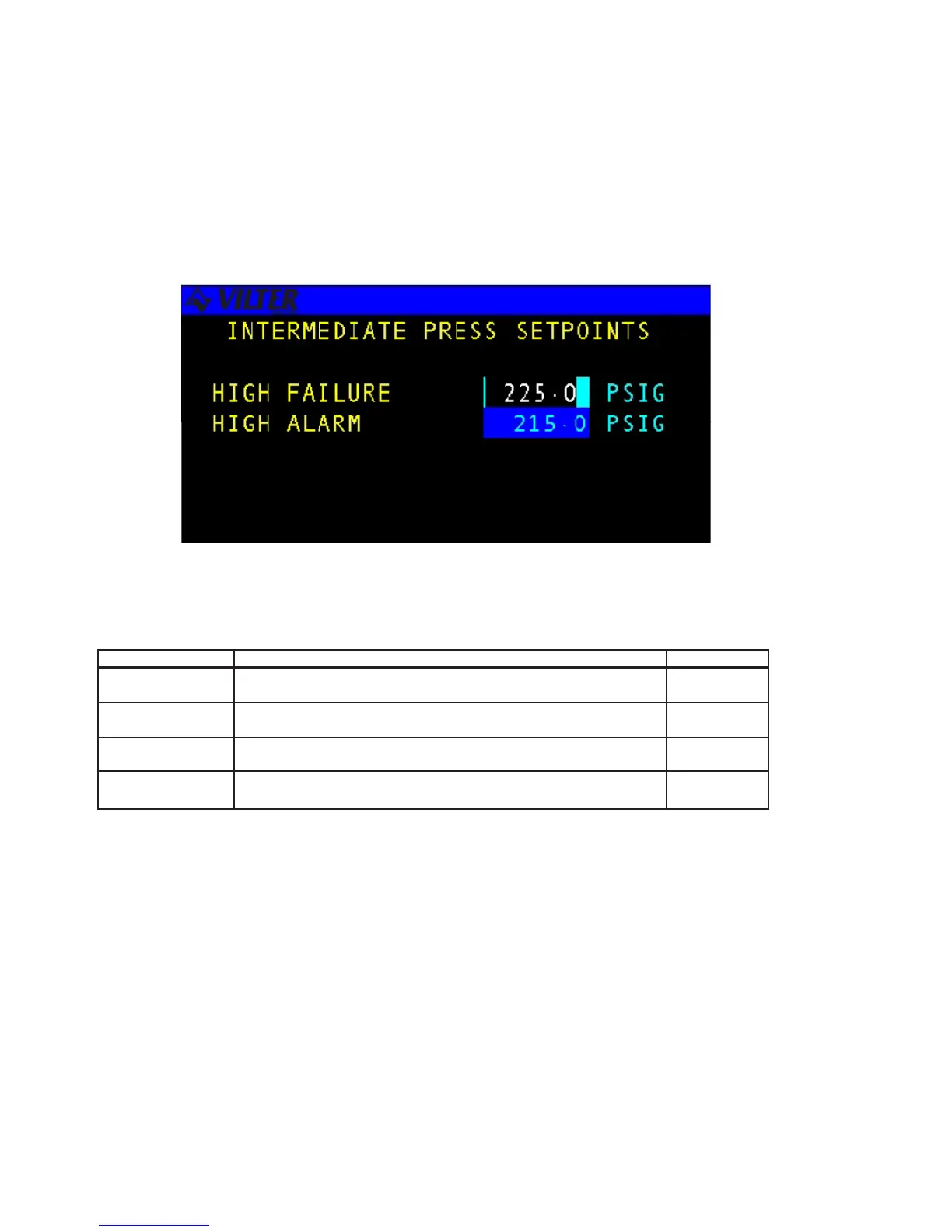 The INTERMEDIATE PRESSURE SETPOINTS screen allows the operator to set acceptable ranges for the