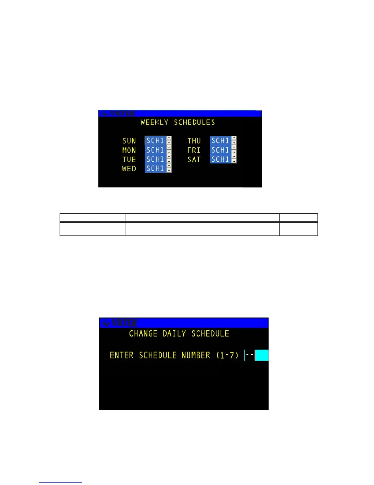 The WEEKLY SCHEDULE screen is used to define which of the seven available daily schedules is to be