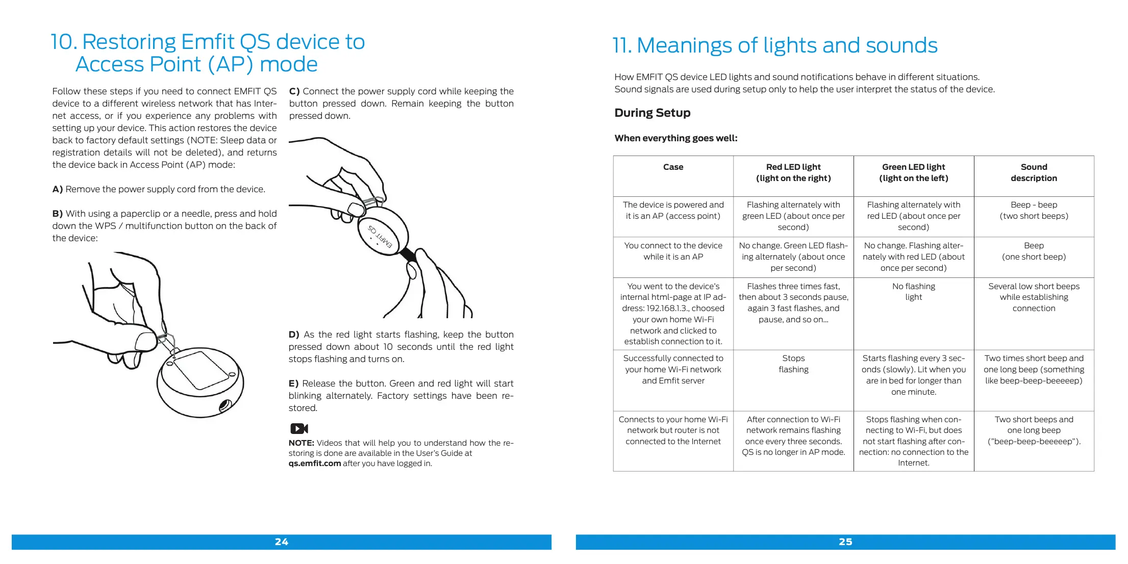 How EMFIT QS device LED lights and sound notifications behave in different situations.