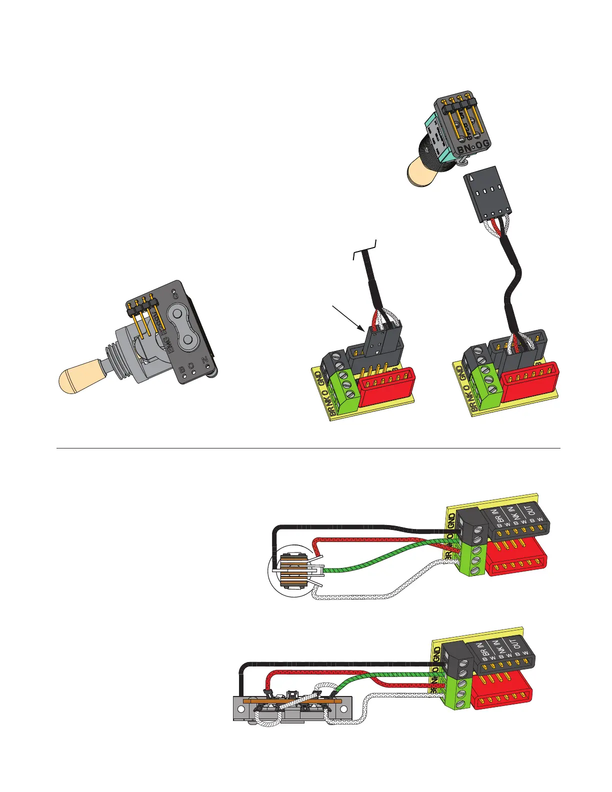 All EMG Solderless Toggle Switches use the same “BNOG” wiring scheme: