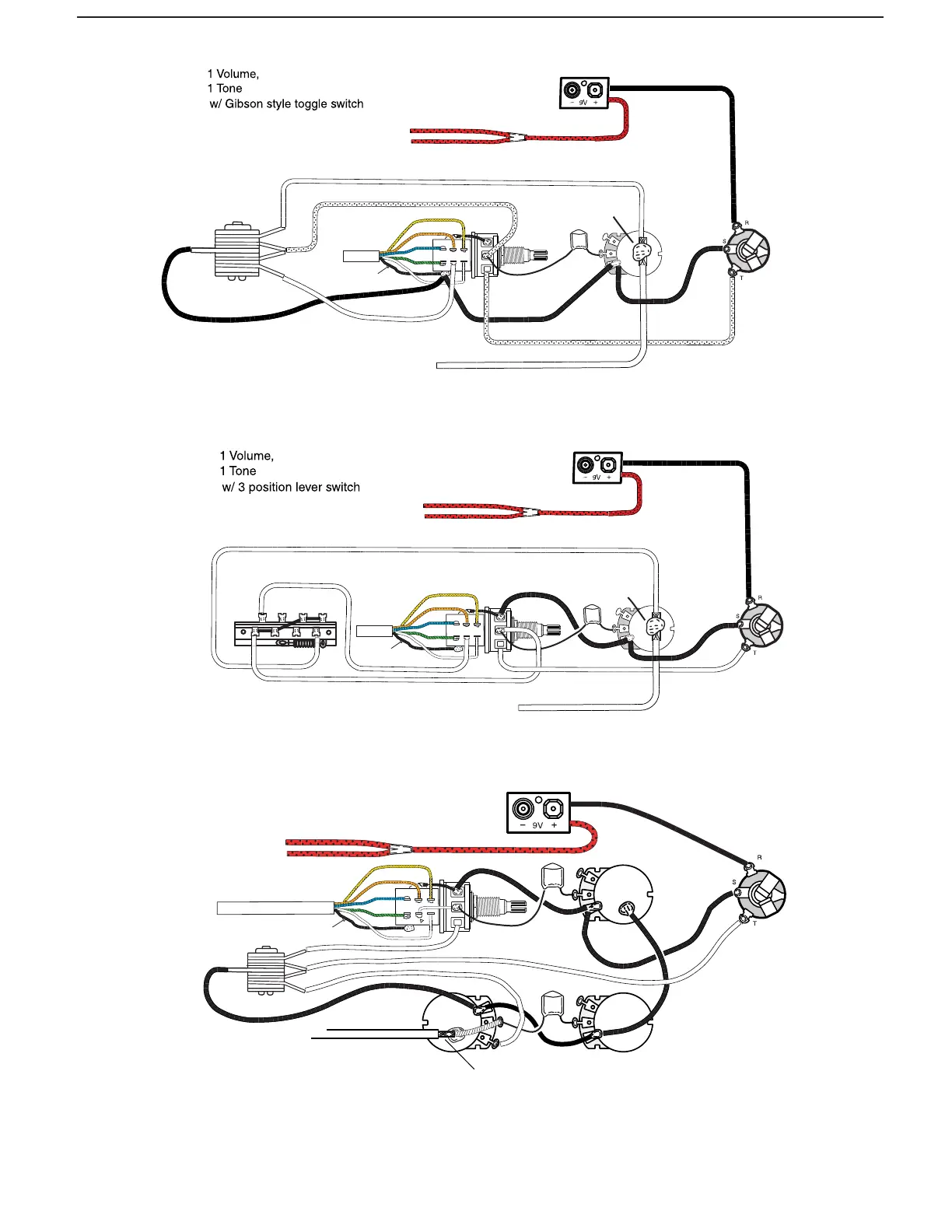 EMG EMG-89 - Guitar Wiring Configurations; 2 Pickup, 1 Volume, 1 Tone with Toggle Switch; 2 Pickup, 1 Volume, 1 Tone with 3-Position Switch; 2 Pickup, 2 Volume, 2 Tone with 3-Way Toggle