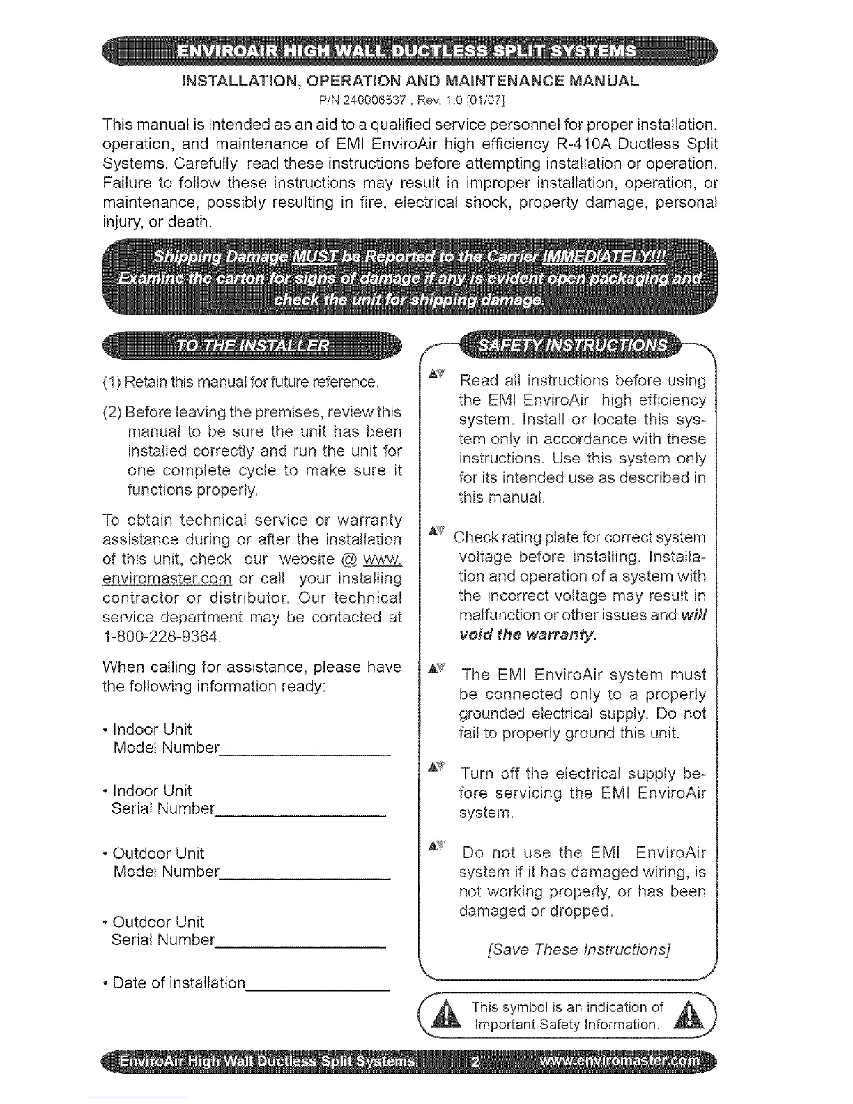 operation, and maintenance of EMI EnviroAir high efficiency R-410A Ductless Split