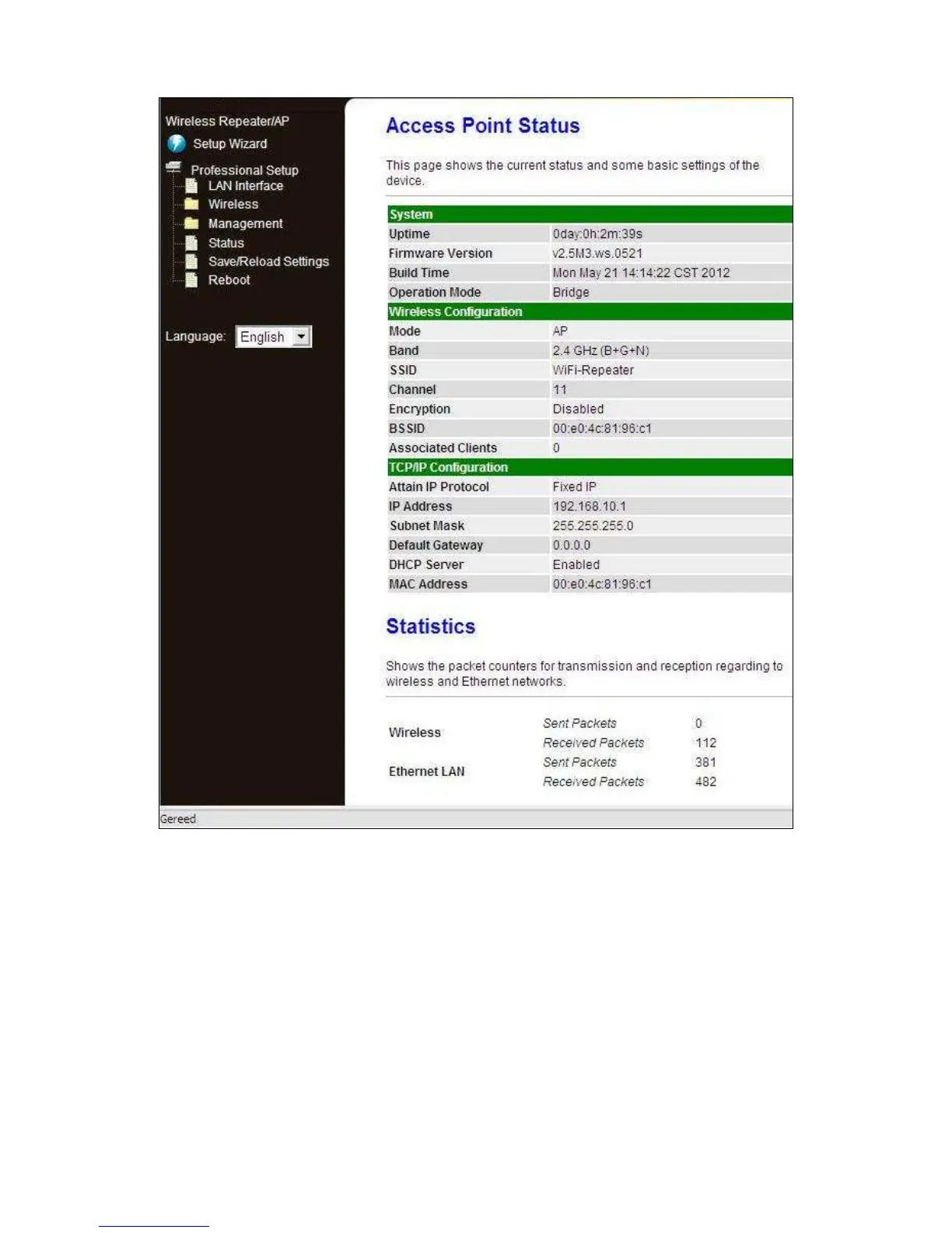 Eminent EM4590 - Access Point Status Overview; System and Wireless Configuration Details; TCP;IP and Statistics Monitoring
