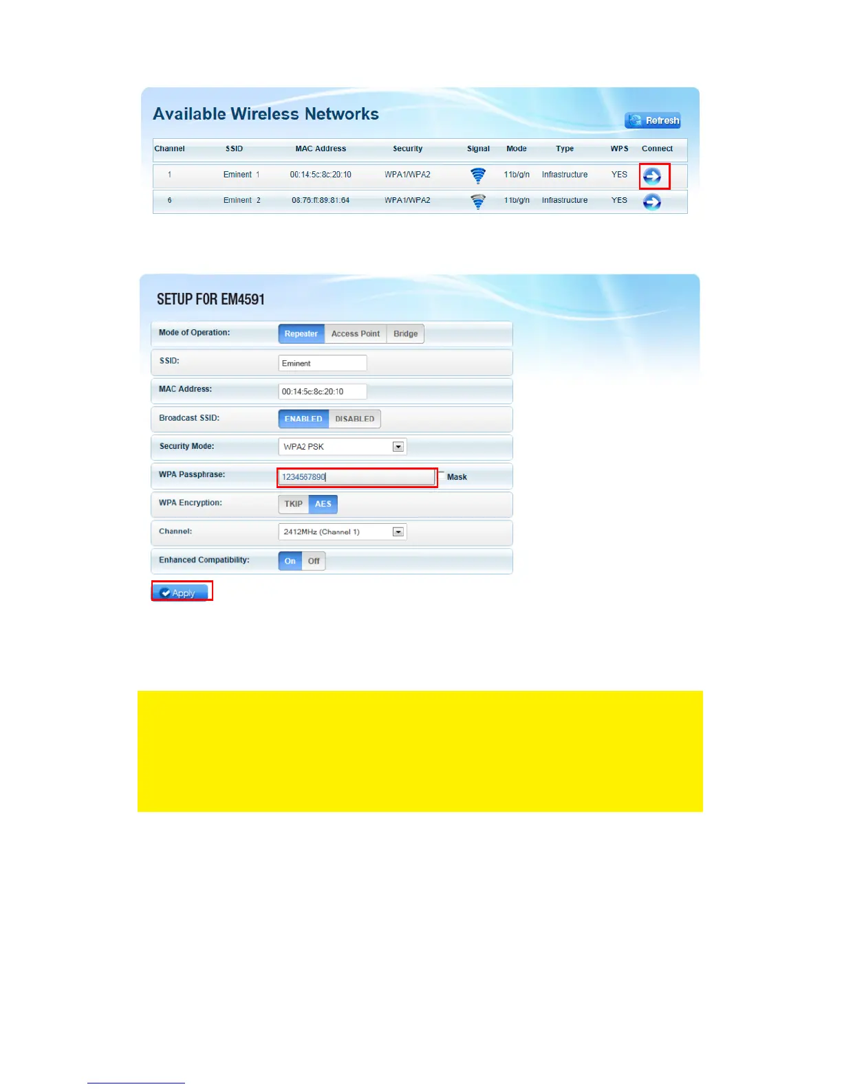 Note: The EM4591 now has the same SSID (no longer “Eminent_repeater”) as the