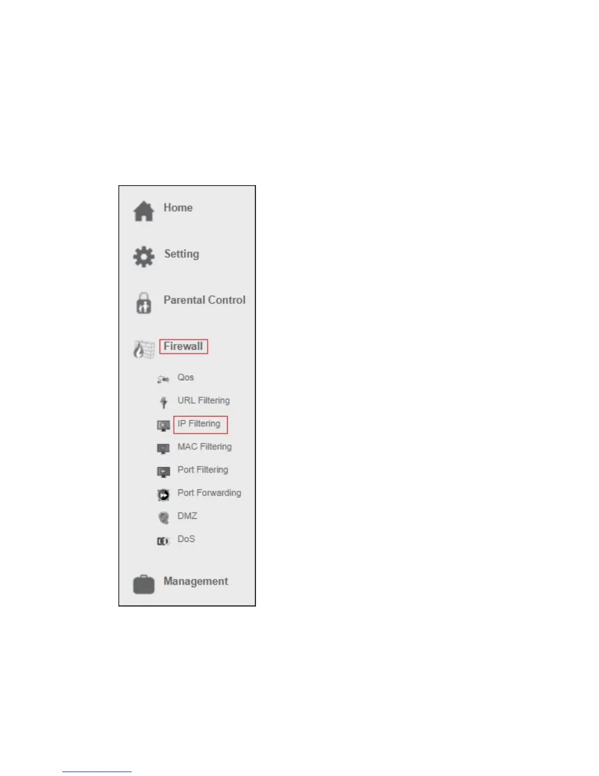 1. From the left-hand menu, click on “Firewall” – “IP Filtering”.