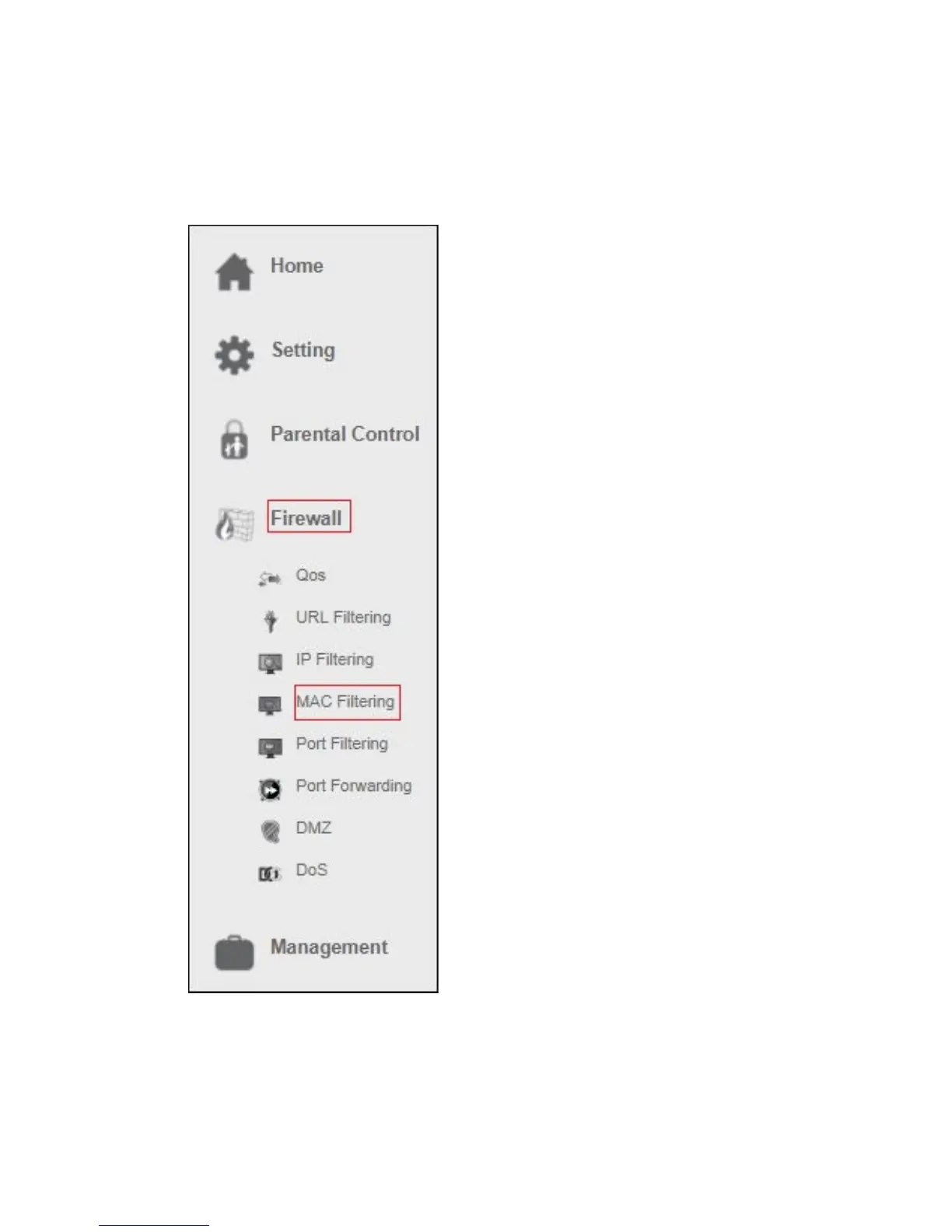 1. From the left-hand menu, click onFirewall“MAC Filtering”.