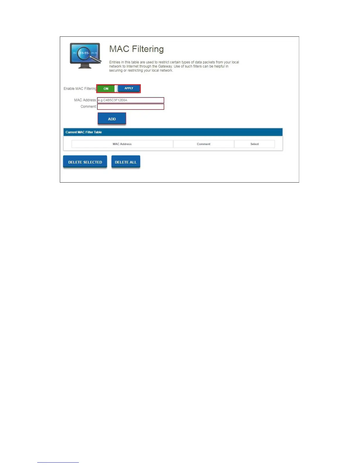 2. Click the On/Off switch in the field “Enable MAC filtering”. Click “Apply