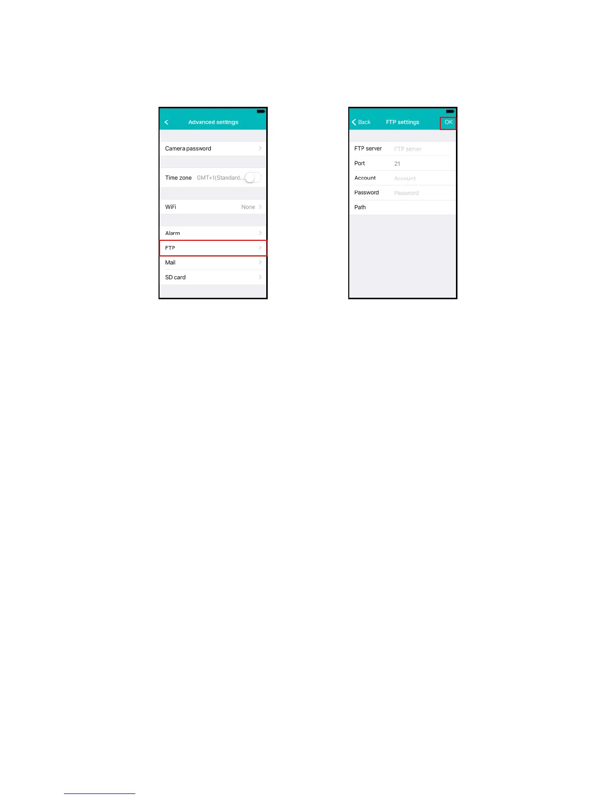Set the FTP server settings for the camera to store the snapshots and recordings after