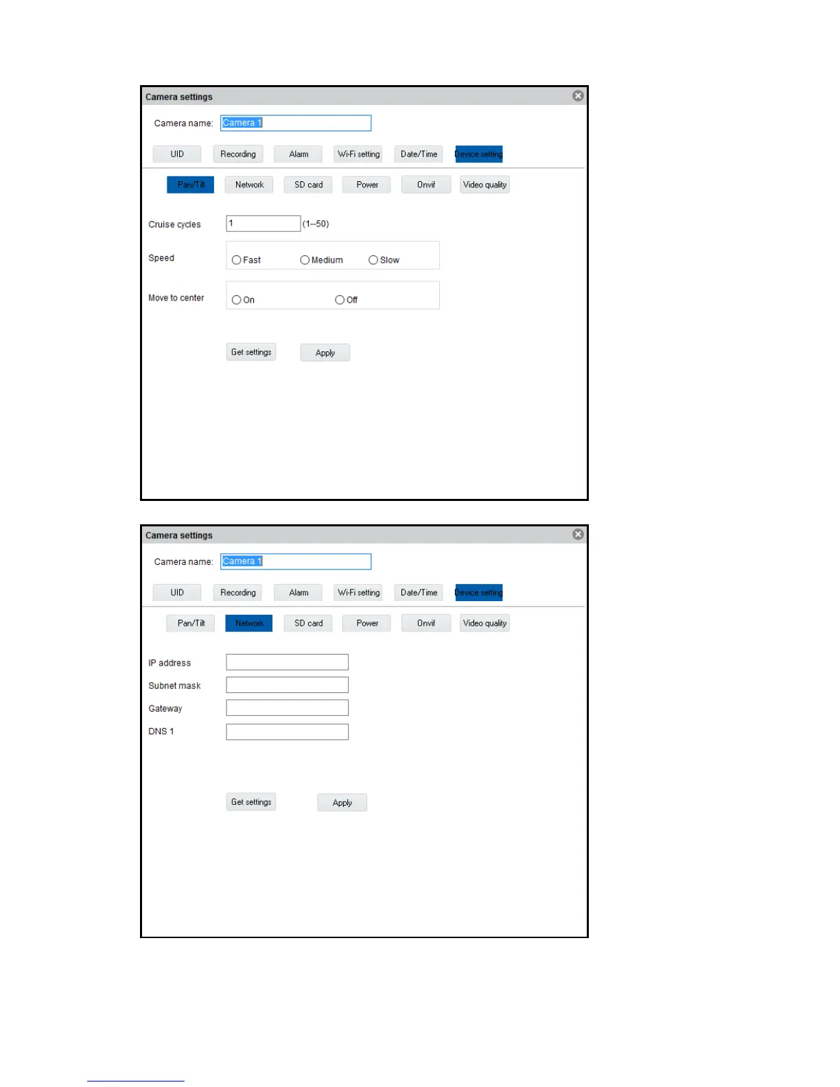 Network: Here you can set the network settings of the camera manually.