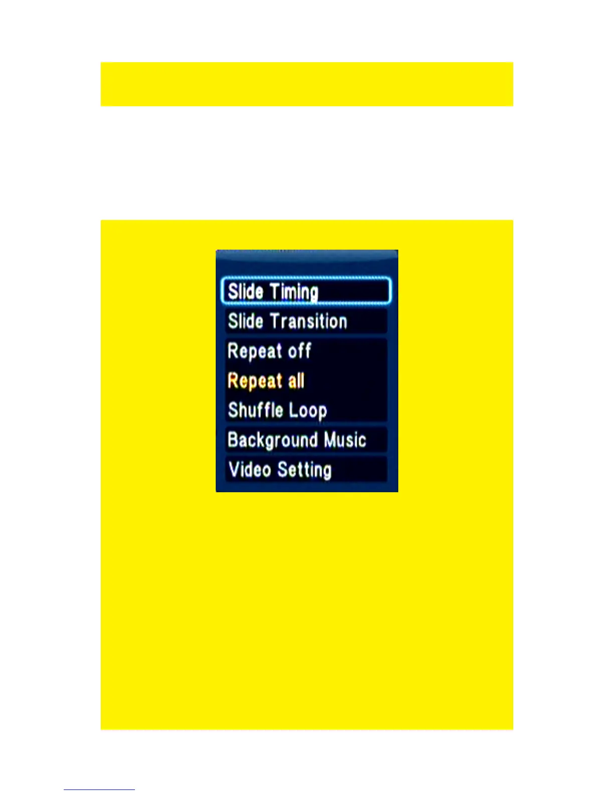 Hint: Press the ‘Menu’ button while playing an image file to acquire the options as