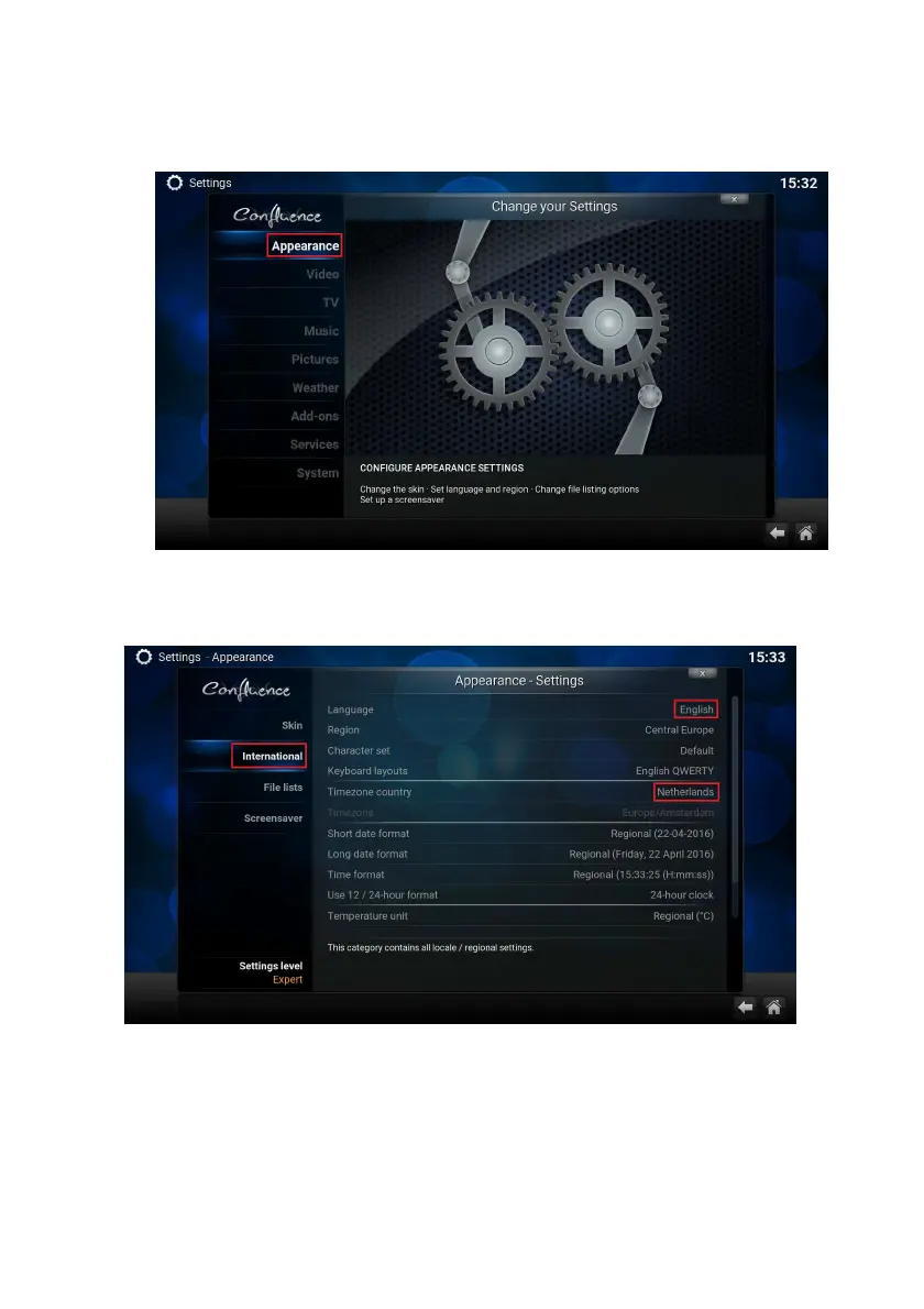 4. Select ‘International’. With the navigation buttons go to the right side and enter