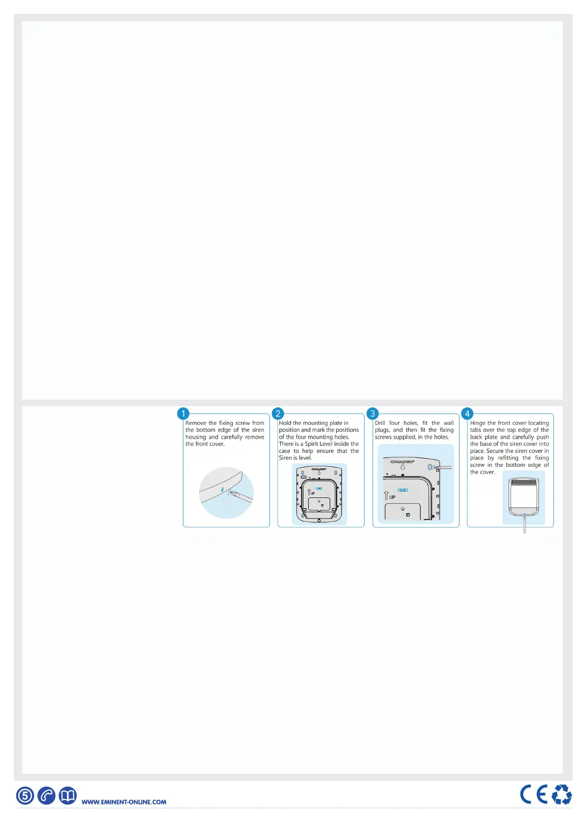 NL Open de behuizing en verwijder de beschermstrip van de accu’s. Houd de montage plaat tegen de muur en teken de boorgaten af. Door de ingebouwde waterpas is de sirene eenvoudig