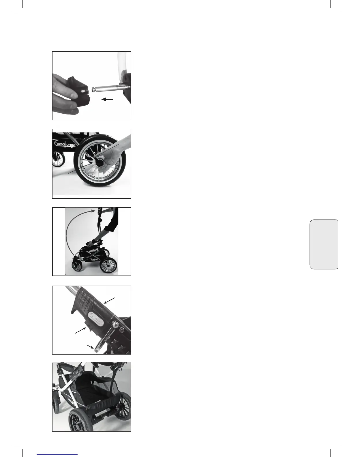 button (2) on wheel hub (1), slide the wheel all the way onto axle.