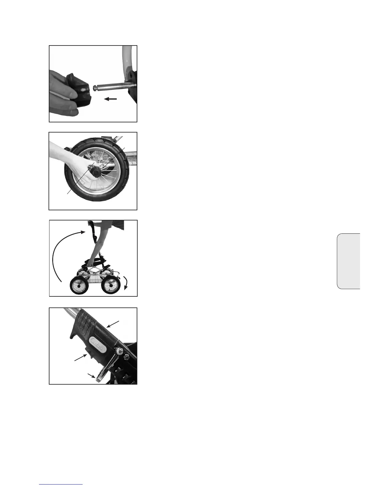 button (1) on wheel hub, slide the wheel all the way onto axle (2).