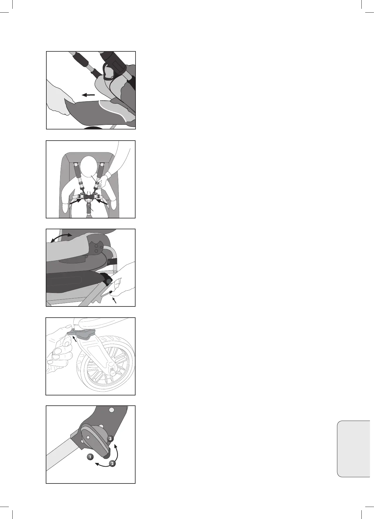 • Bruk alltid selen når barnet sitter i vognen. Sjekk at alle spenner