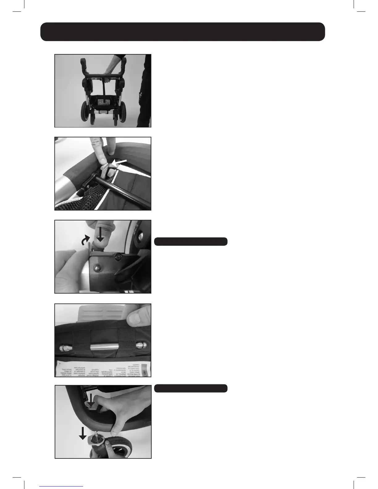 • Tryck in den gråa knappen på frambågen och dra ut framhjulet.