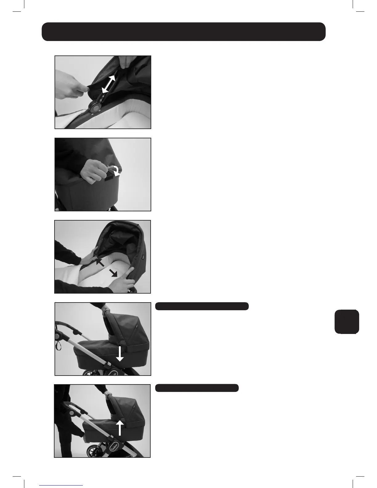 • Aktivizējiet bremzes. Paceliet gultiņu aiz roktura un novietojiet