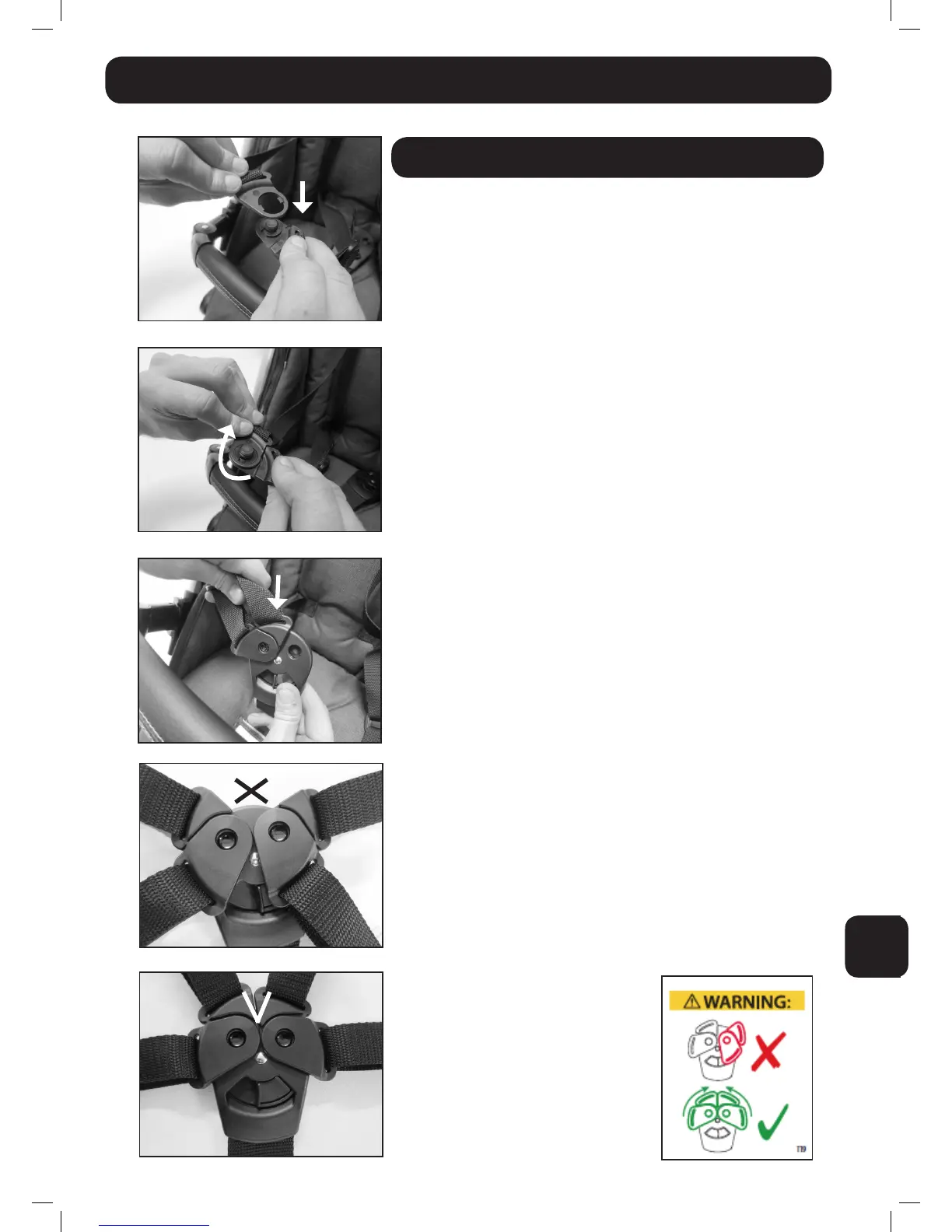 • Sprawdzić, czy sprzączki są zapięte w sprzączce krocznej.