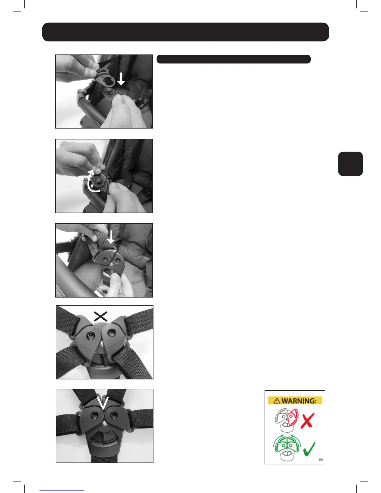 • Führen Sie die Gurte von oben in das Gurtschloss am Schritt-
