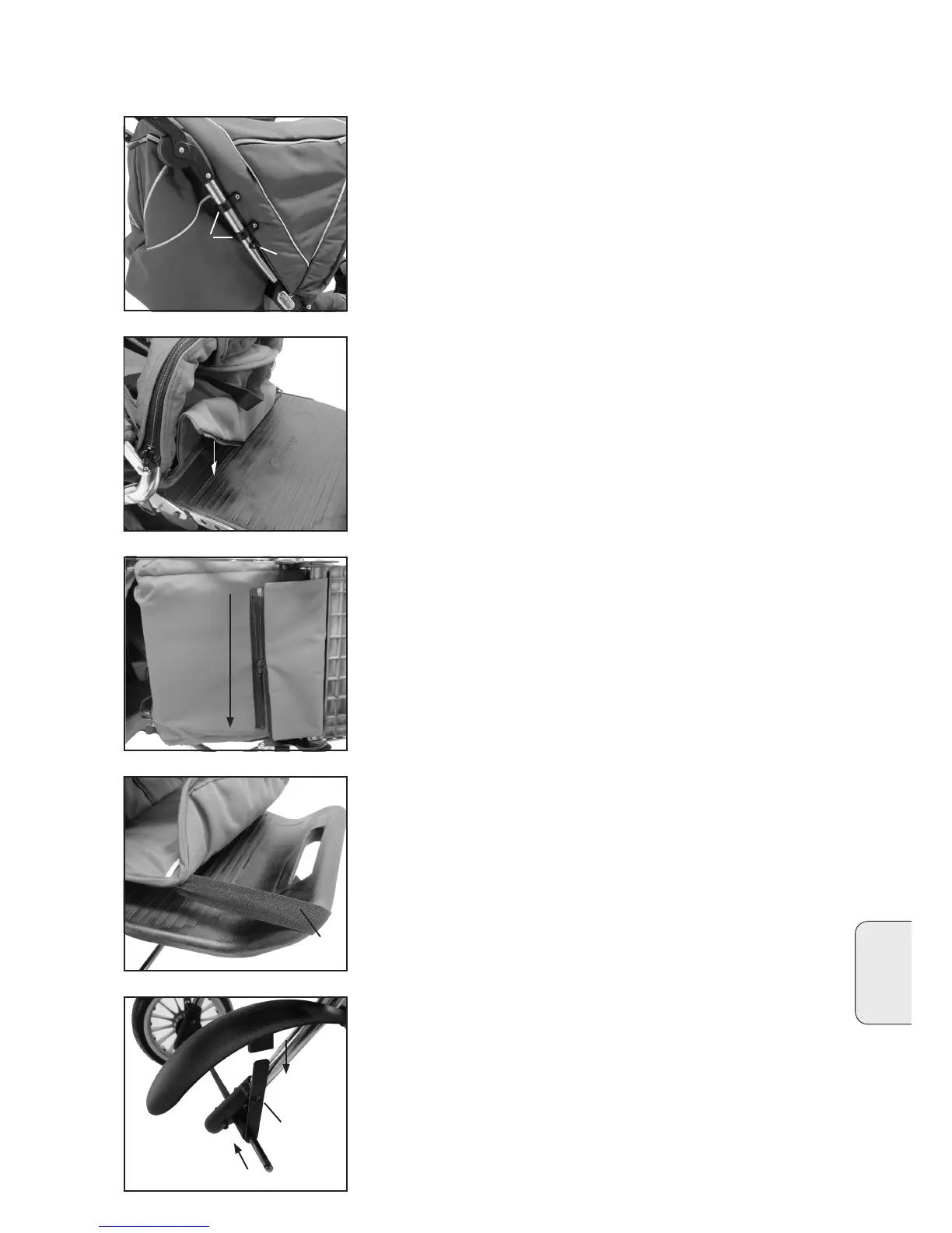 • Provlečete stranu látky se zipem otvorem v nožní opěrce (20).