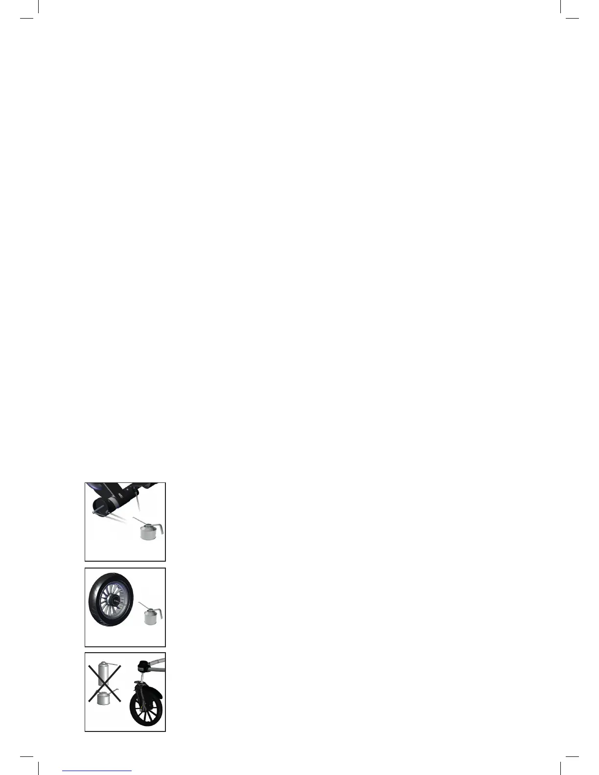 • Riteņu asis un piekares sistēmu ir ieteicams eļļot reizi trijos mēnešos (pirms eļļošanas notīriet asis ar