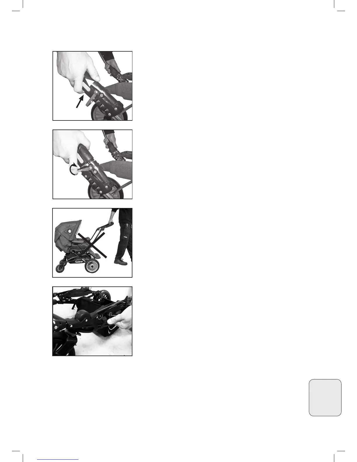 • Nikdy netahejte kočárek s předními otočnými koly za vámi. Kočárek