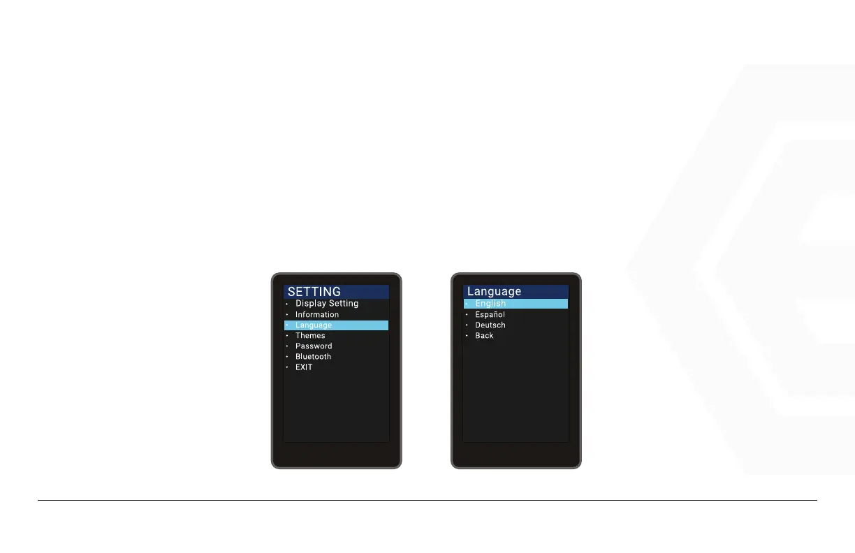 guage selection interface, move the cursor to toggle between “English”, “Español” and “Deutsch” and then