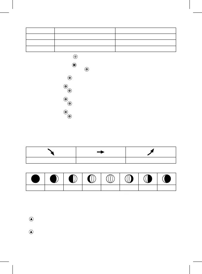 1 – Újhold; 2 – Növekvő holdsarló; 3 – Első negyed; 4 – Növekvő hold; 5 – Telihold; 6 – Fogyó hold;