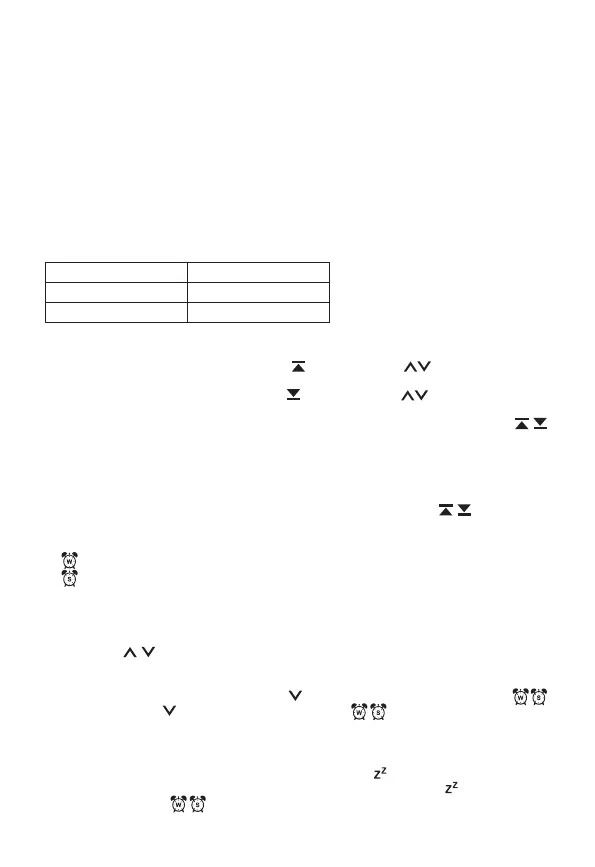 3. Ar pogām / iestatiet modinātāja stundas un minūtes; turot pogu nospiestu, regulēšana