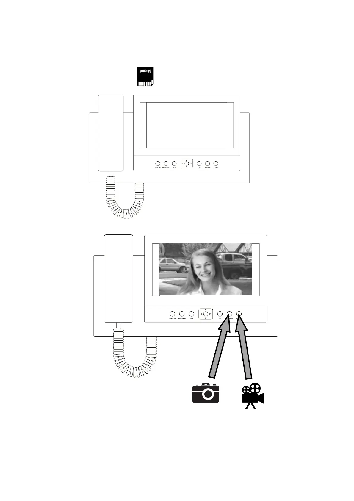 After accepted call or preview of the picture the video monitor stores an AVI video file on SD card.