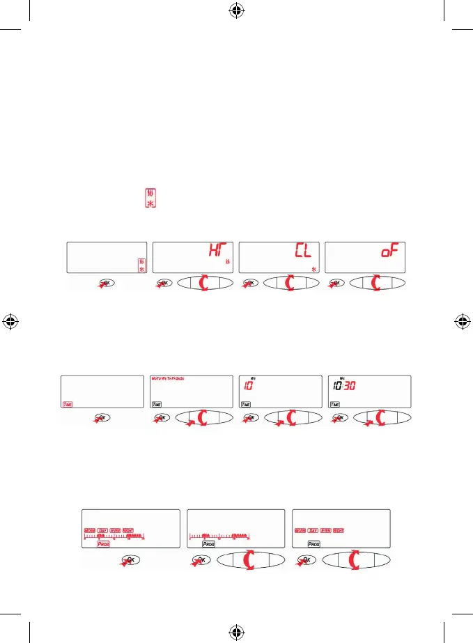 Valjčićem odaberite HT za grijanje, CL za hlađenje, ili OF za isključivanje termostata.