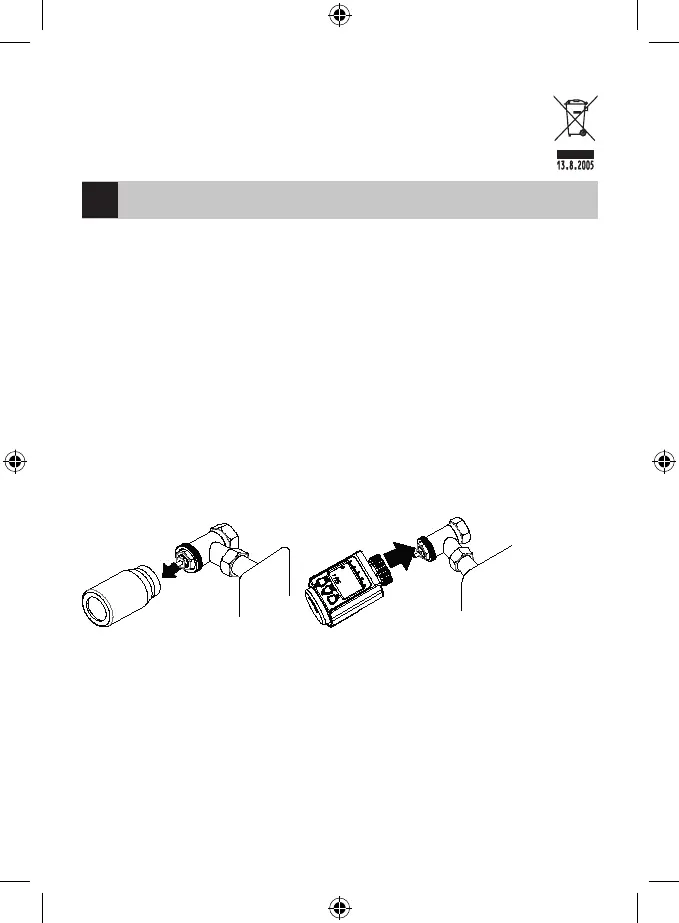 2. Pred instalacijo vstavite v glavo bateriji. O Odstranite staro termostatsko glavo z odvitjem matice na glavi