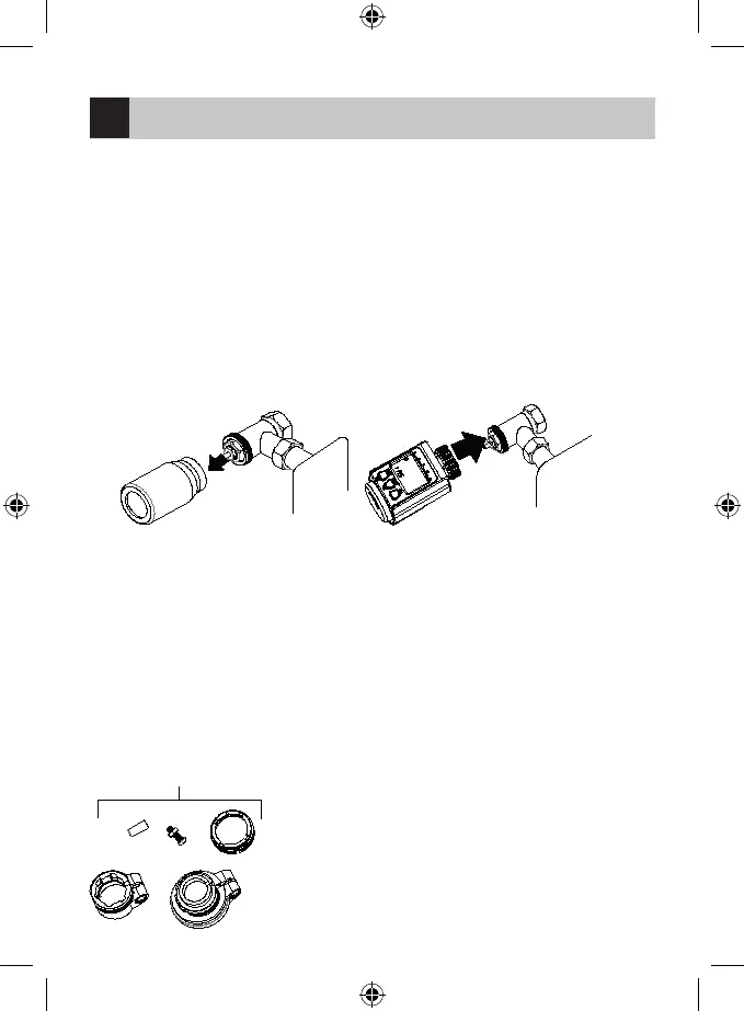 2. Prieš montuodami įstatykite elementus į radiatoriaus vožtuvą. Atlaisvinkite veržlę ant radiatoriaus vožtuvo ir