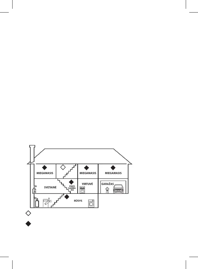 Jei montuojate tik vieną įspėjamąjį prietaisą, įrenkite jį šalia miegamojo (ne rūsyje ar kt.).