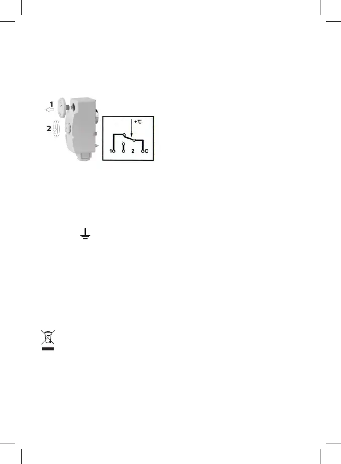 1. Термостат відкрийте знявши числовик (1) та відпустіть великий пластиковий гвинт (2).