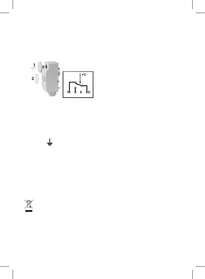 1. Para abrir el termostato, retire la ruedecilla (1) y aoje el tornillo de plástico (2).