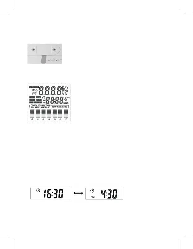 pārslēgt uz 12 stundu režīmu, vienlaikus turiet nospiestas pogas “HISTORY” un “ENER-