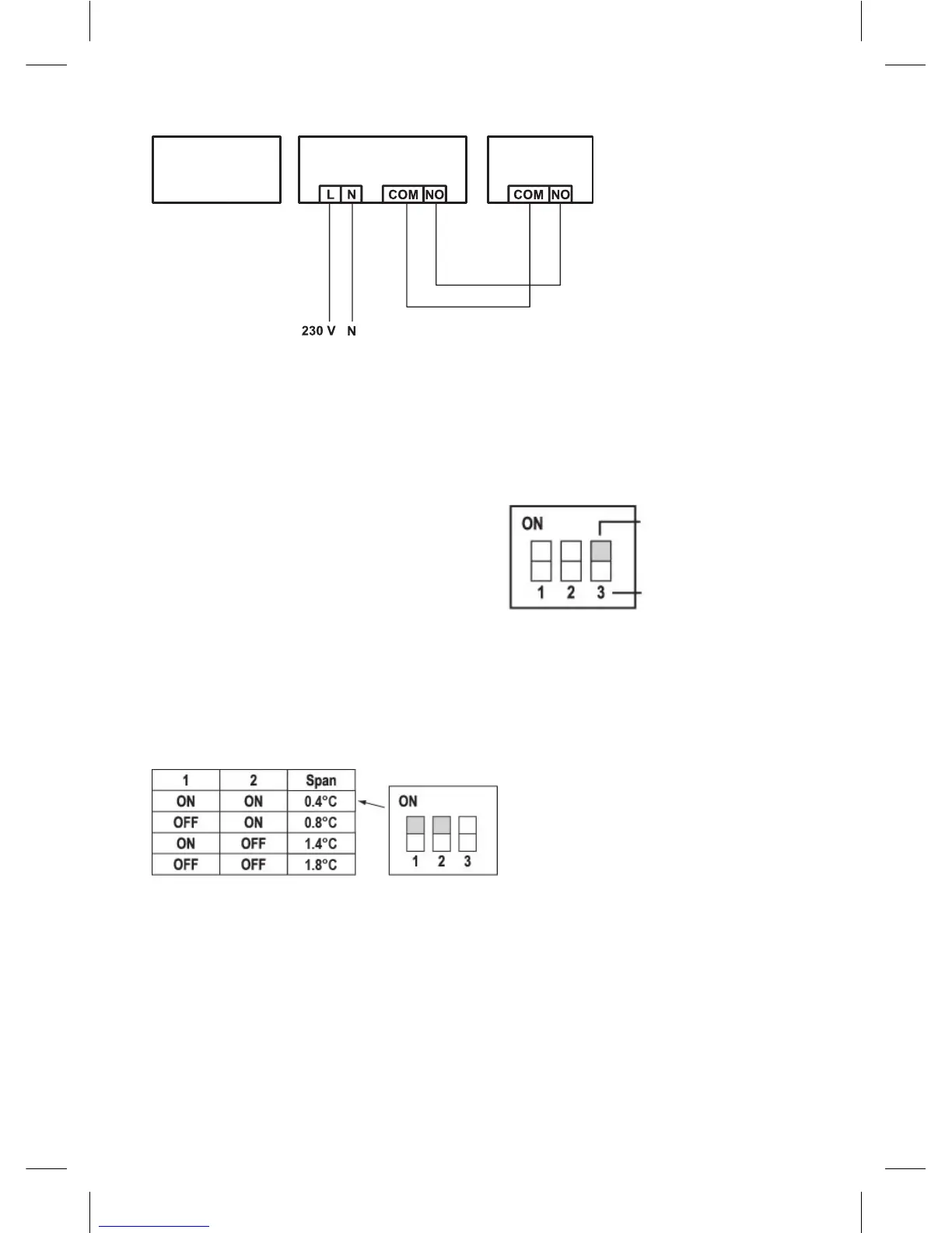 klesne na 19,2°C a vypne se, pokud teplota dosáhne 20,8°C. Nastavte DIP přepínače (pozice 1 a 2)