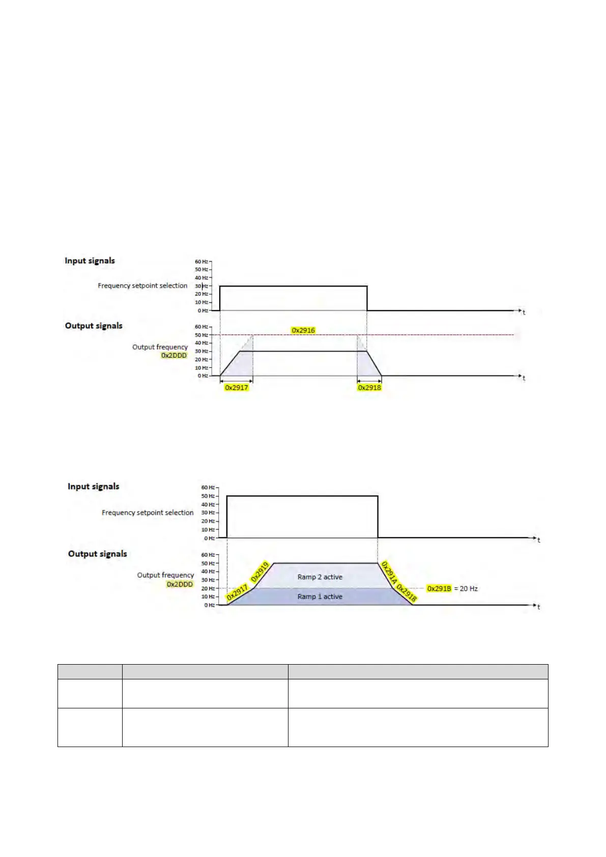 • For ramp 2, the acceleration time 2 set in 0x2919 (P222.00) and the deceleration time