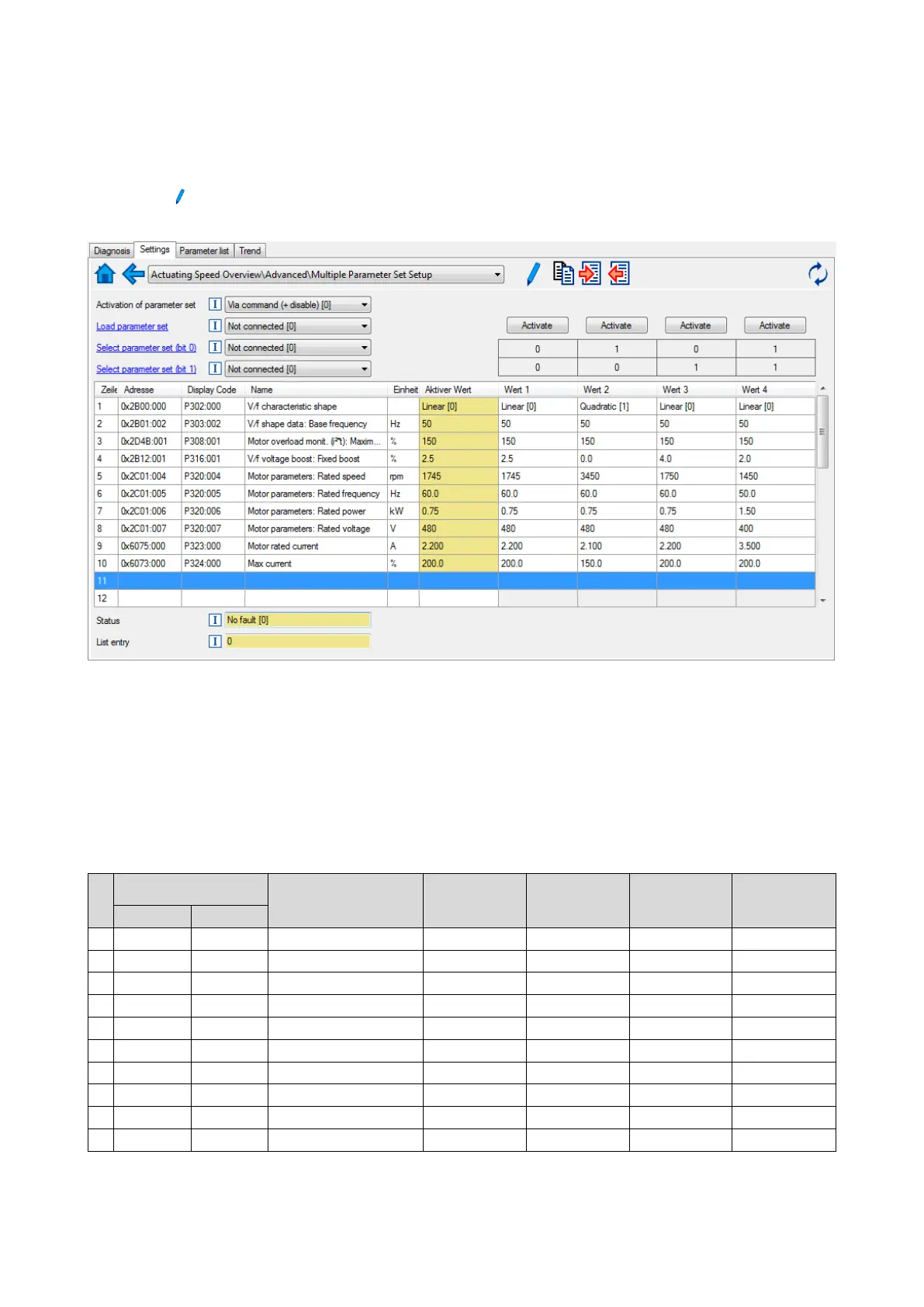 2. Set values for motor M1 ... M4 in the corresponding fields: