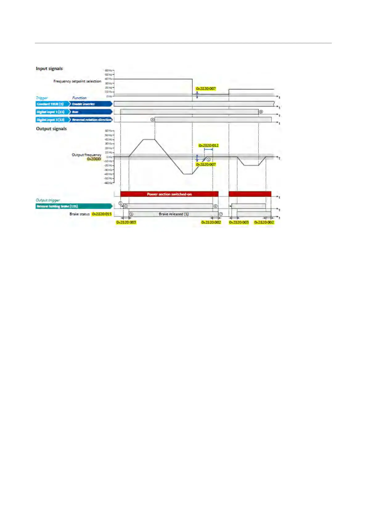 brake closing threshold set in 0x2820:007 (P712.07), the output frequency is ramped