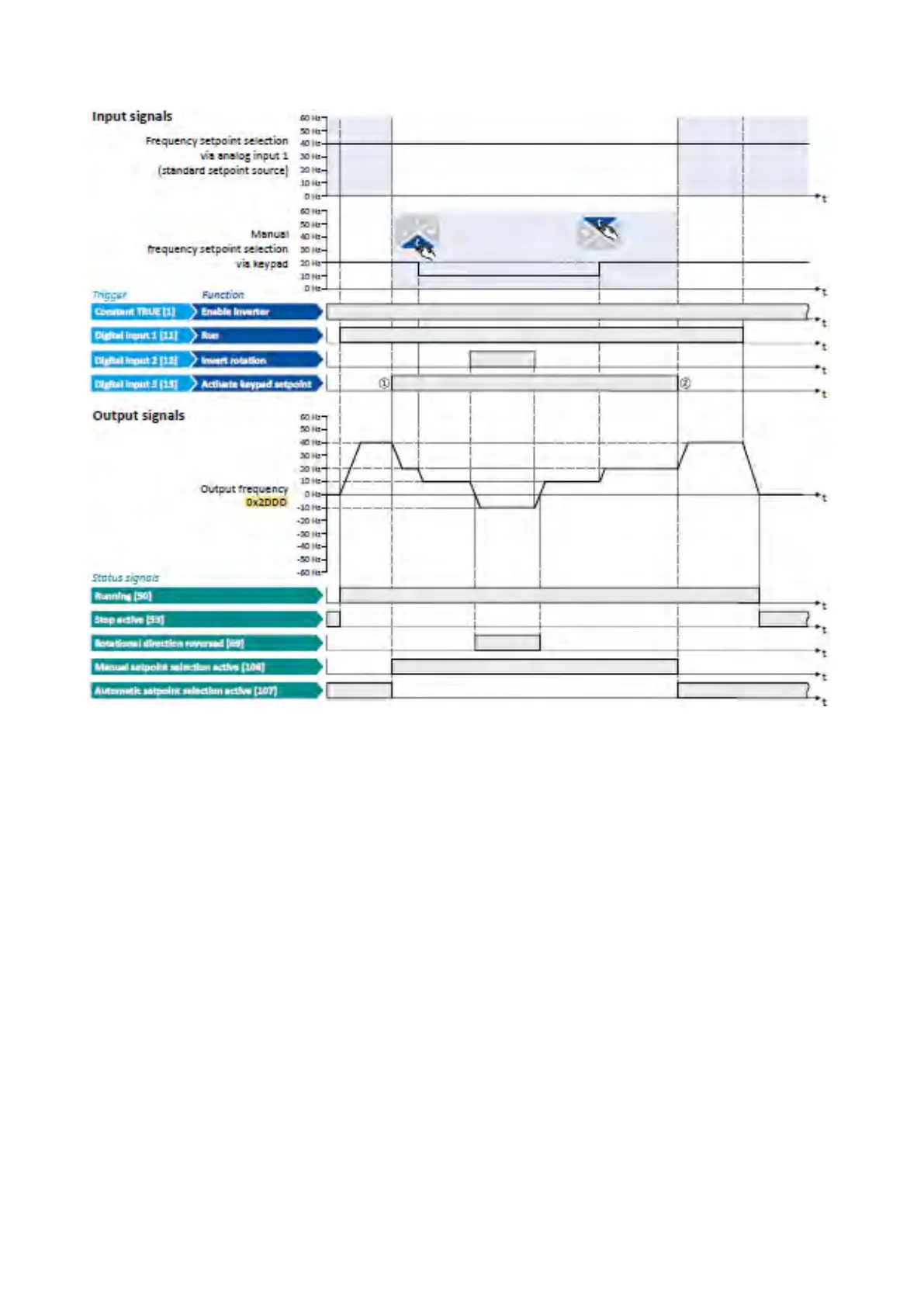 Change-over from analog input 1 (standard setpoint source) to keypad setpoint.