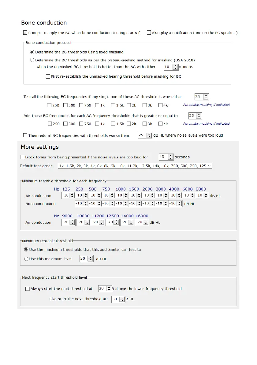 too loud, minimum and maximum test thresholds and what dB level you want each frequency to begin