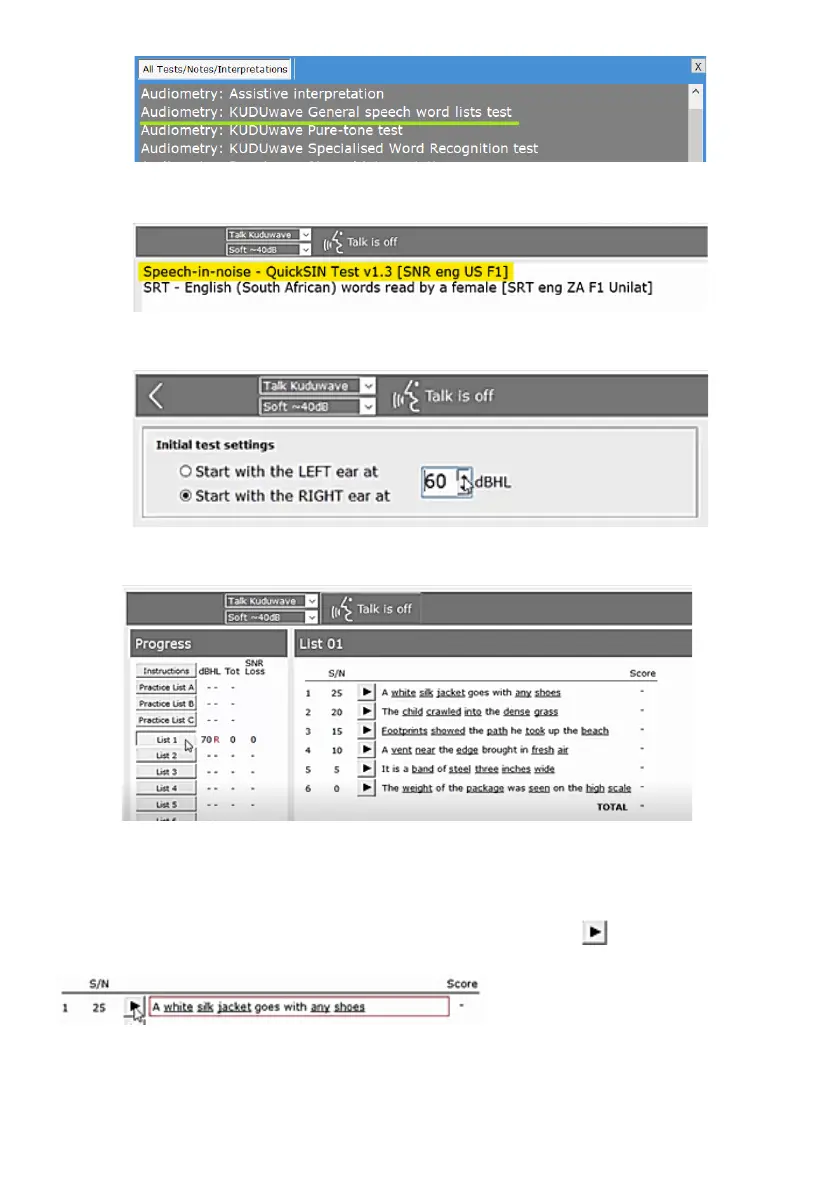 A list of 6 sentences with 5 keywords per sentence, is presented within a babble noise. The sentences