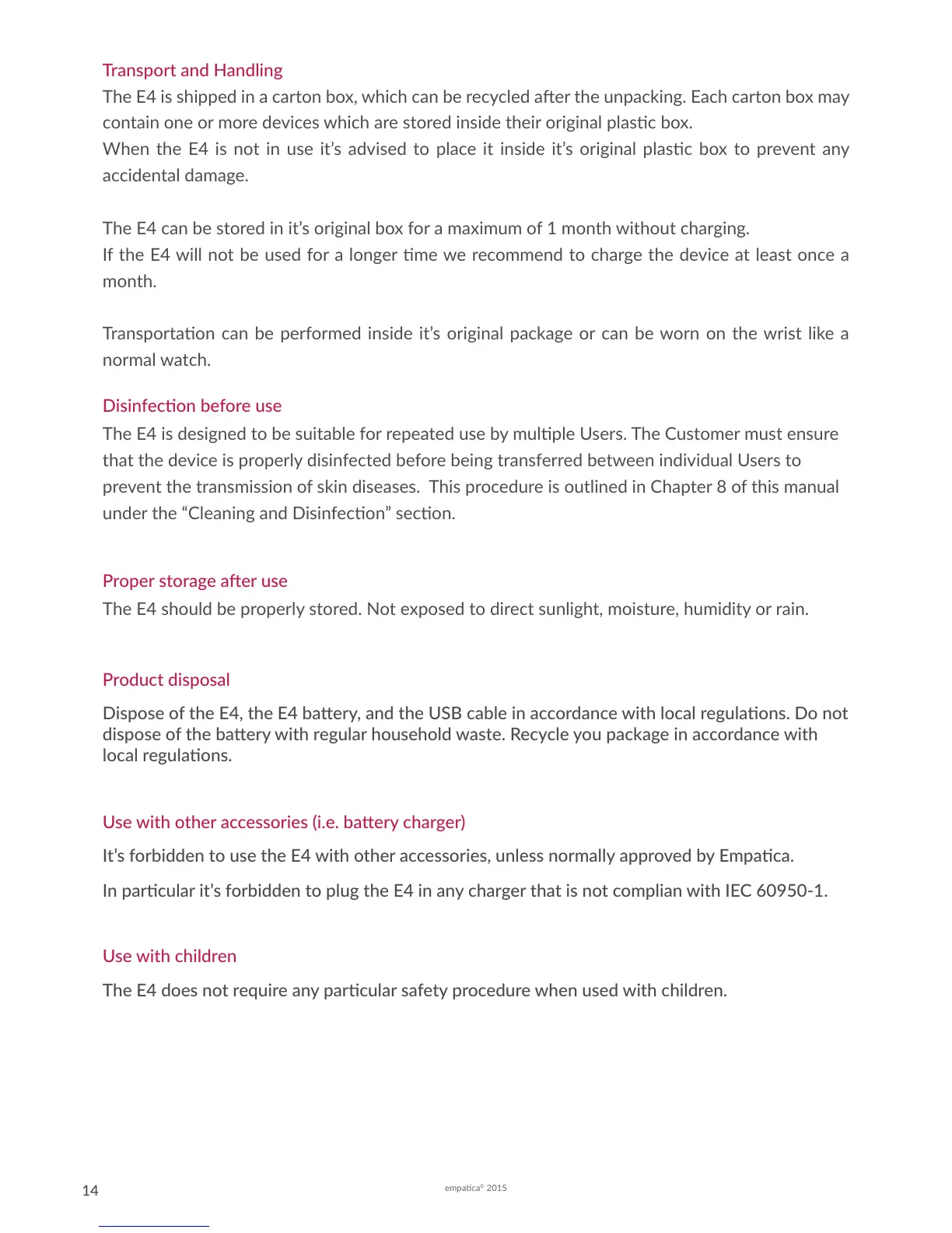 Dispose of the E4, the E4 baery, and the USB cable in accordance with local regulaons. Do not