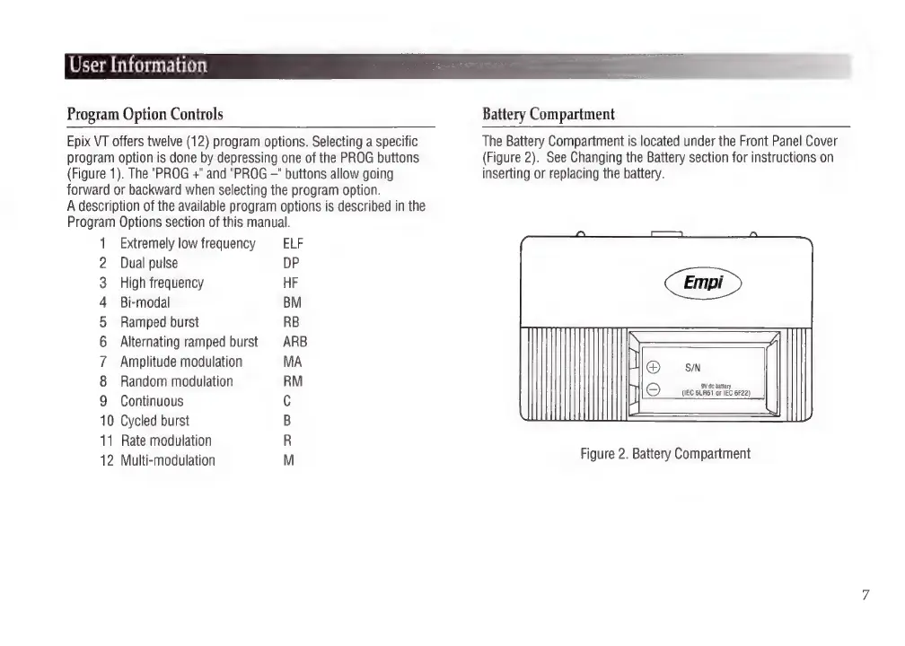 Empi EPIX VT - Program Option Controls; Battery Compartment