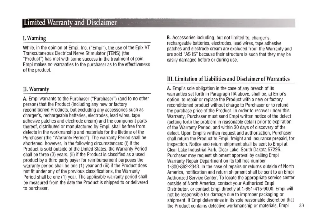 Empi EPIX VT - Limited Warranty and Disclaimer; Limitation of Liabilities and Disclaimer