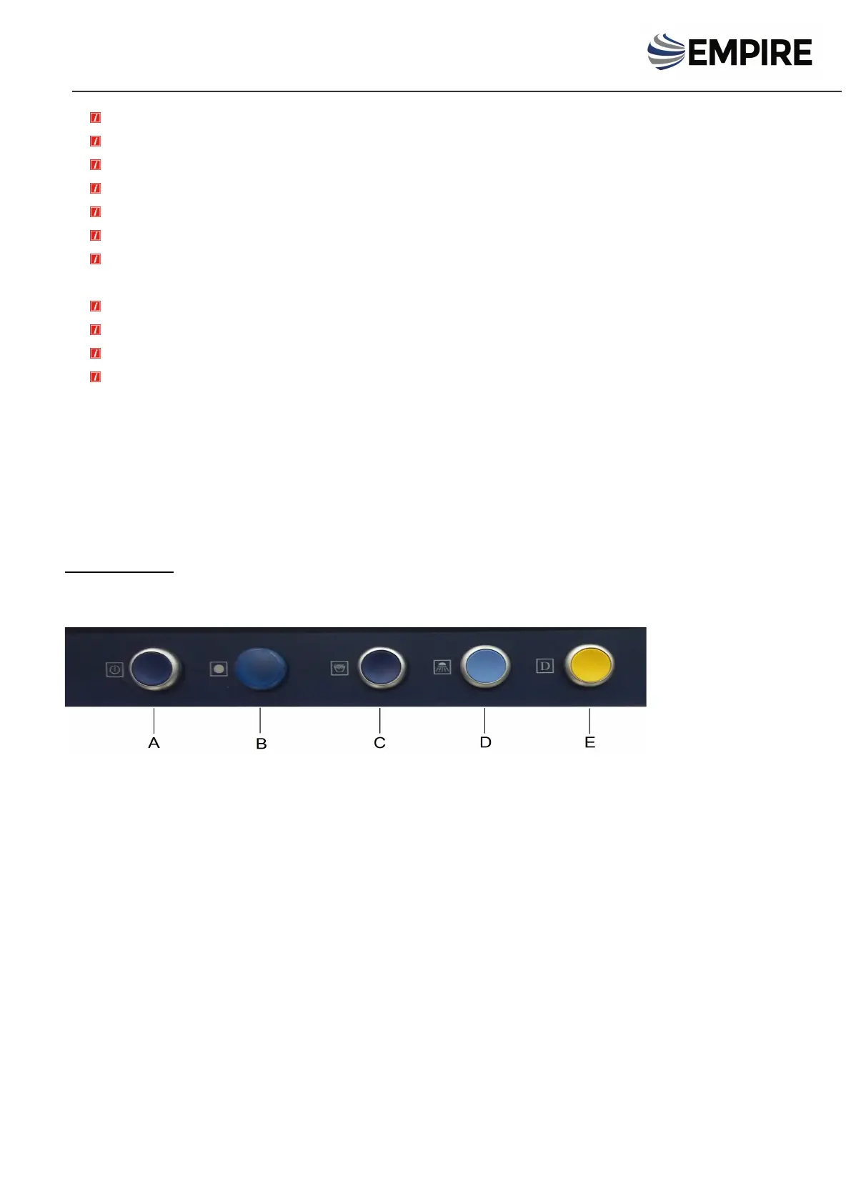 D- MANUAL RINSE PUSH BUTTON E- DRAIN PUMP START BUTTON