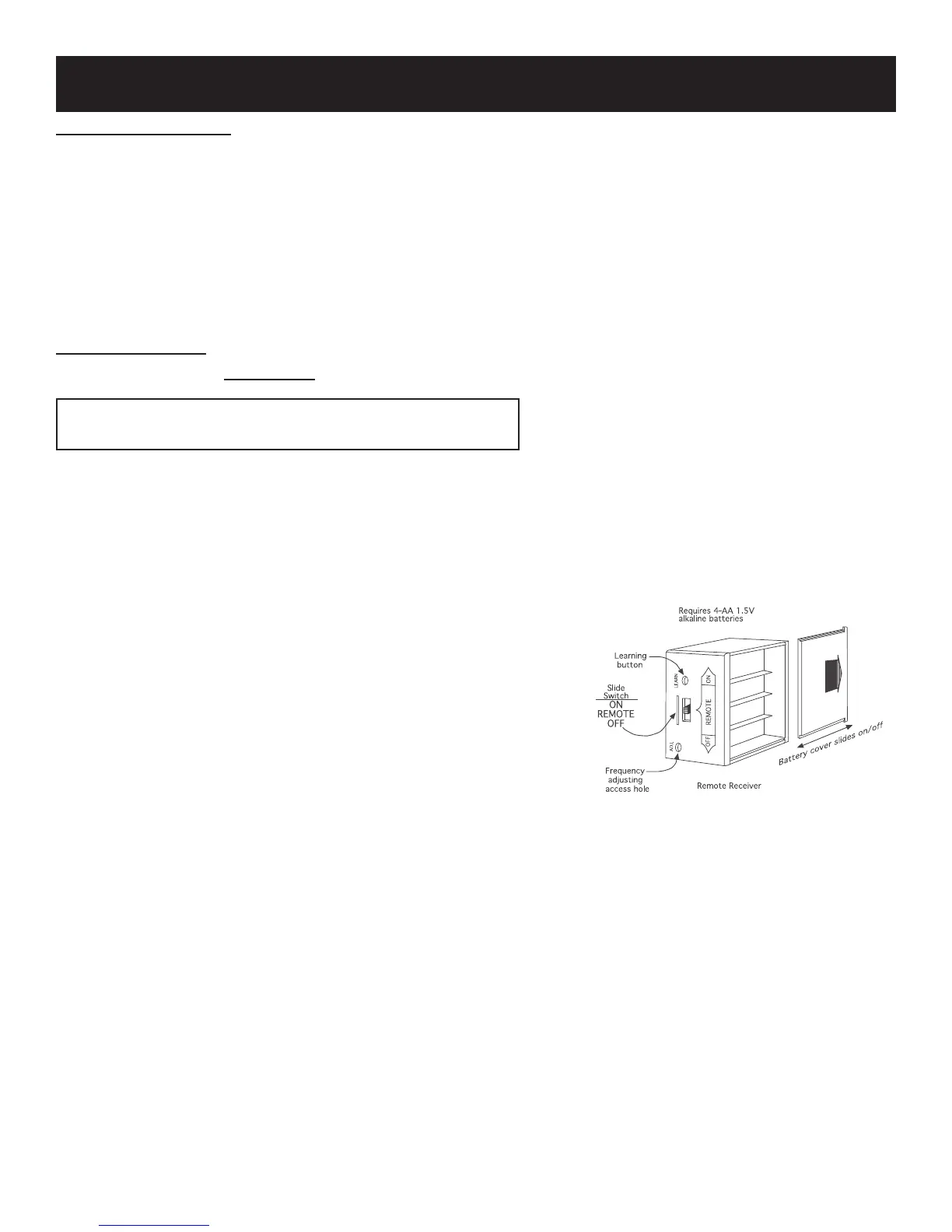 The remote receiver operates on 4 AA-size 1.5V batteries. It is recommended that ALKALINE batteries be used for longer