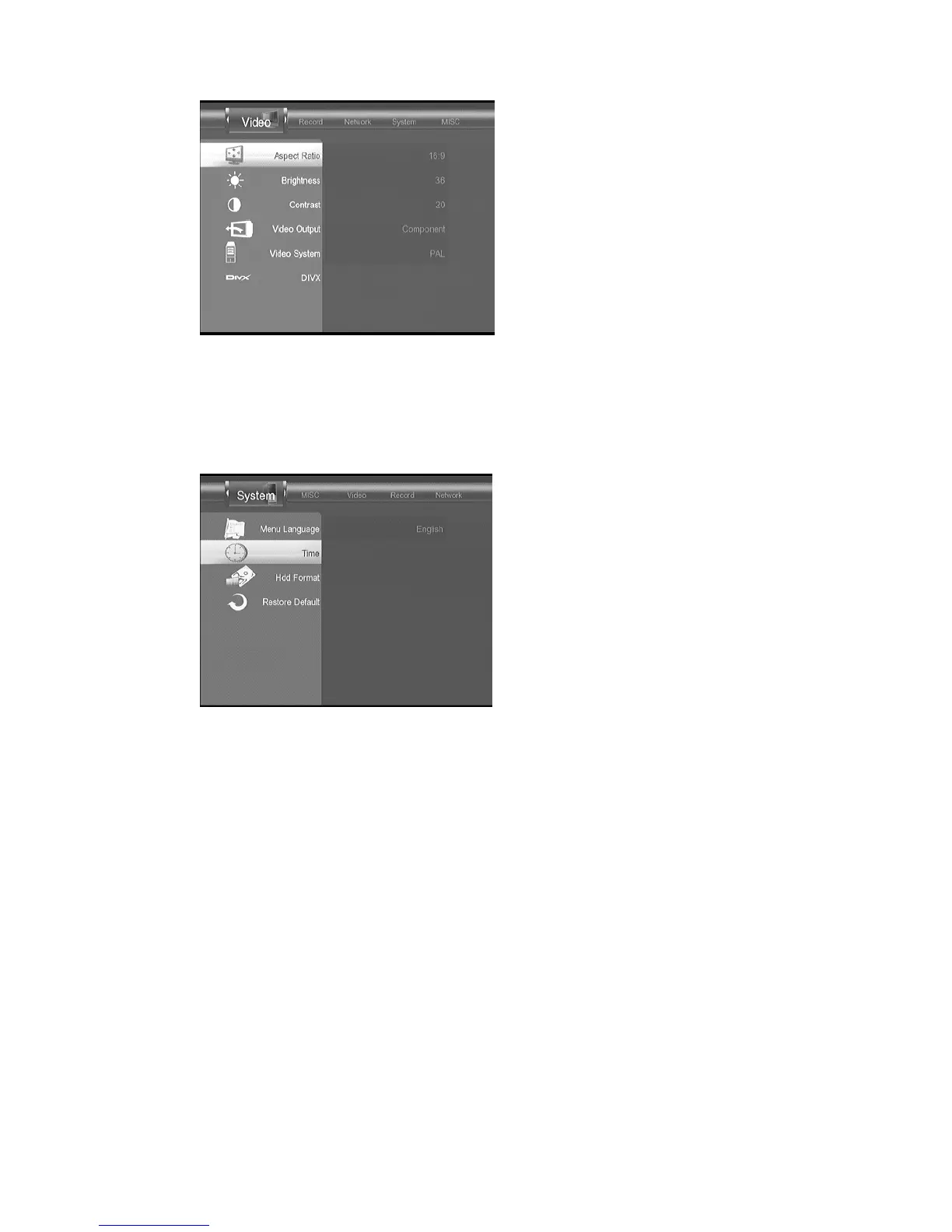 Figure: Video setup menu